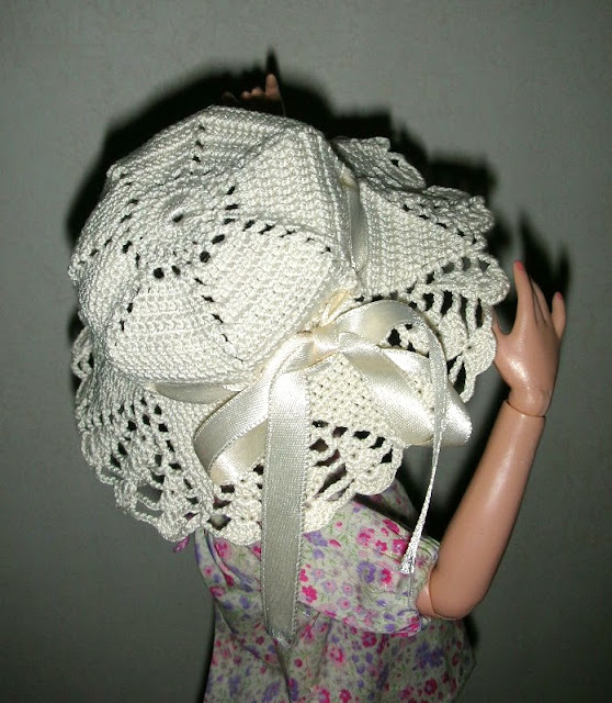 La capeline est réalisée en suivant les explications d'un livre consacré aux miniatures au crochet.